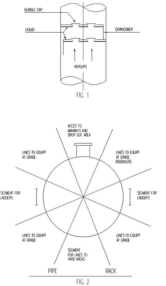 Column is interconnected with other process equipment so it must be located adjacent to pipe rack to allow piping connections to run to and from the rack in orderly fashion. Automatically this means that manways (provided for erection of trays and maintenance) should be located on the opposite side of the column away from the rack to provide suitable access for equipment required to be removed (see below figures). This is not mandatory since occasions arise when other arrangements are necessary.