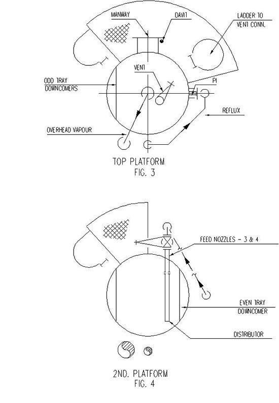 The most important connections are the feeds (see figures 4 and 6). These may occur over the odd or even trays or a combination of both. Their elevational location is entirely a function of process design. Depending upon this, orientation of the nozzle will follow, but ensure that the nozzle is not located behind the downcomer from the tray above. This would result in a liquid build up in the downcomer restricting flow through the tray below and preventing correct operation.