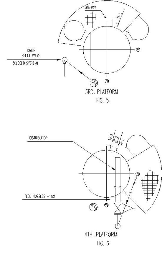 Relief valves vary in number and size. Location can depend on whether discharge is to atmosphere or a closed system. If discharging to a closed system, locate at a convenient platform down the column above the relief header see below figure 5). If discharging to atmosphere locate on top of the column, with the open end of the discharge a minimum of 3000 mm above the top platform. For maintenance removal, valve should be located to allow top head davit to pick it up. Dependent upon size multiple relief valves may require a gantry structure on the top head.