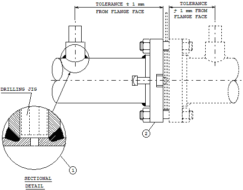 1. The pipe tap connections should be welded to the exact locations shown on the piping isometric. The pipe should then be drilled through the connection, using a drilling jig, with a 12 mm drill for 4” bore pipe and over, 10 mm drill for 3” bore pipe and a 6 mm drill for2½” bore pipe or under. After drilling, remove all burrs from inside of pipe and slightly round the edges of the holes with a hook scraper.